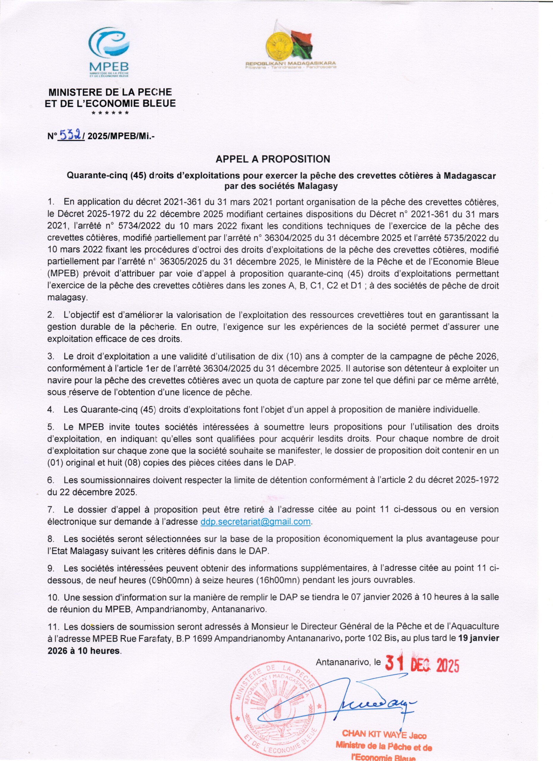 Quarante-cinq (45) droits d'exploitations pour exercer la pêche des crevettes côtières à Madagascar par des sociétés Malagasy
