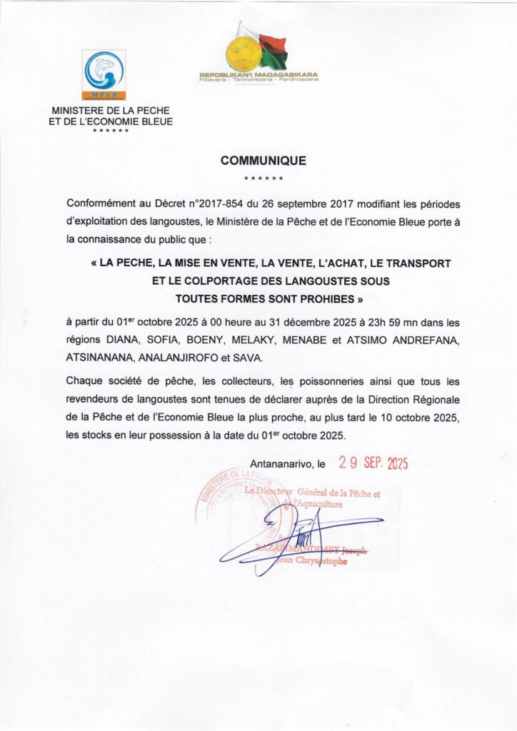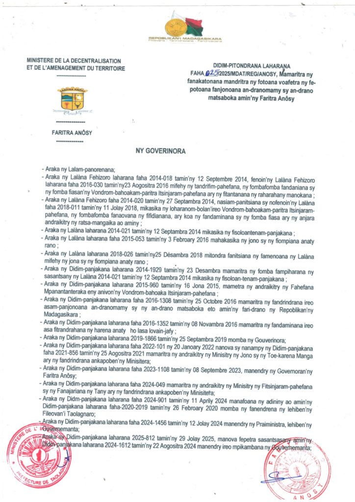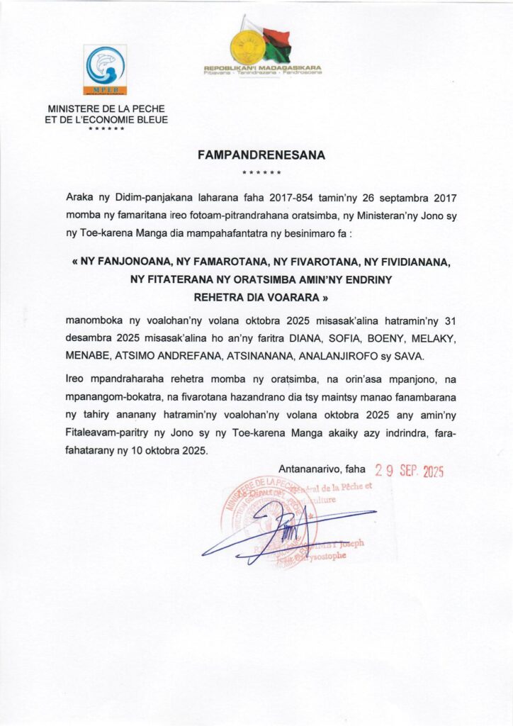 Arrêté mamaritra ny fanakatonana ny fanjonoana andranomamy sy an-drano matsaboka 2025