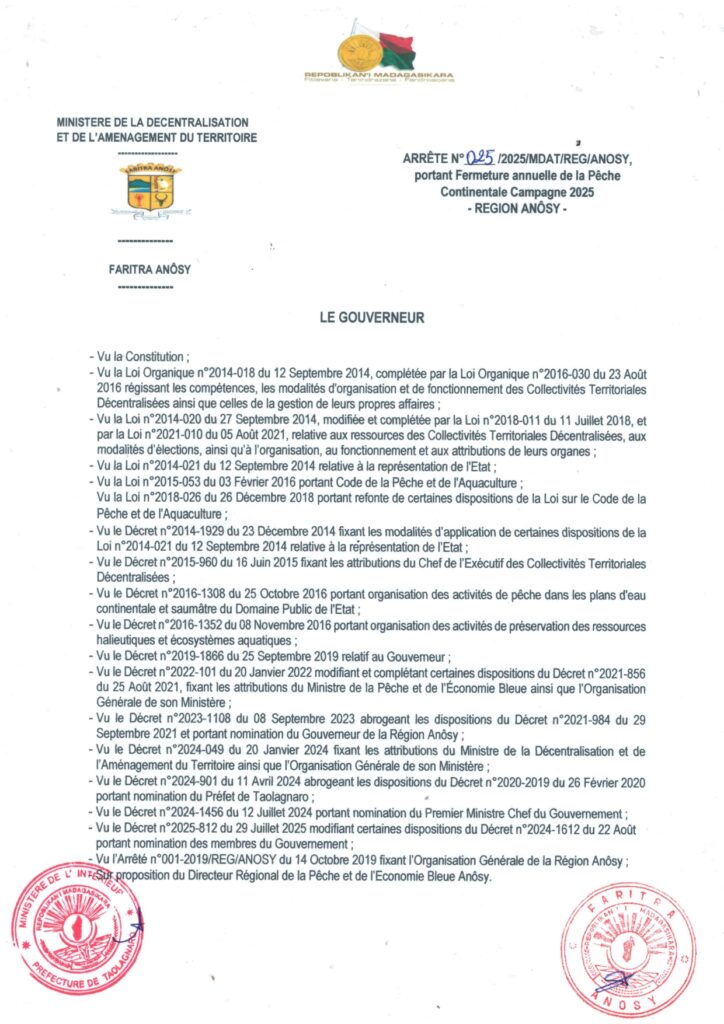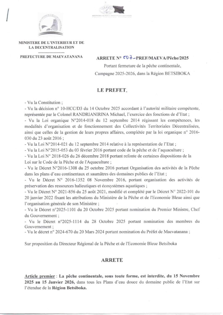 ARRETE N° 007-PREF/MAEVA/Pêche/2025 Portant fermeture de la pêche continentale, Campagne 2025-2026, dans la Région BETSIBOKA